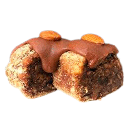 Envuelto en placa crocante de chocolate y granola. Cubierto con ganache de chocolate y almendra.