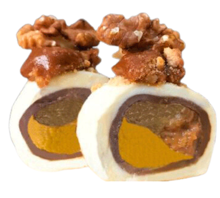 Envuelto en panqueque de chocolate, cubierto con láminas de queso. Con dulce de leche y nuez.