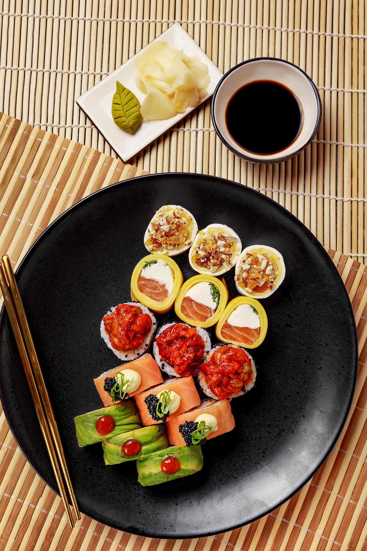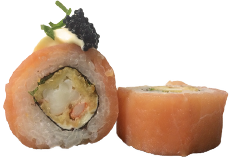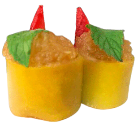 Envuelto en 🍳 TAMAGO y finas láminas de salmón. Coronado con SALSA DE MANGO.