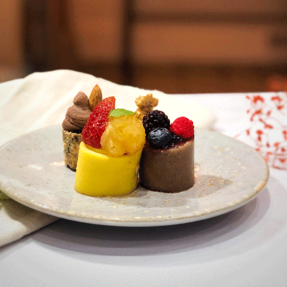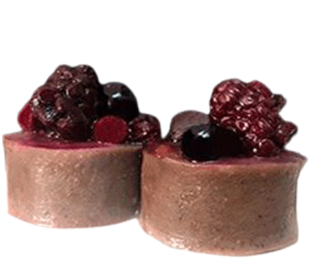Envuelto en panqueque de chocolate y cubierto de coulis de frutos rojos.