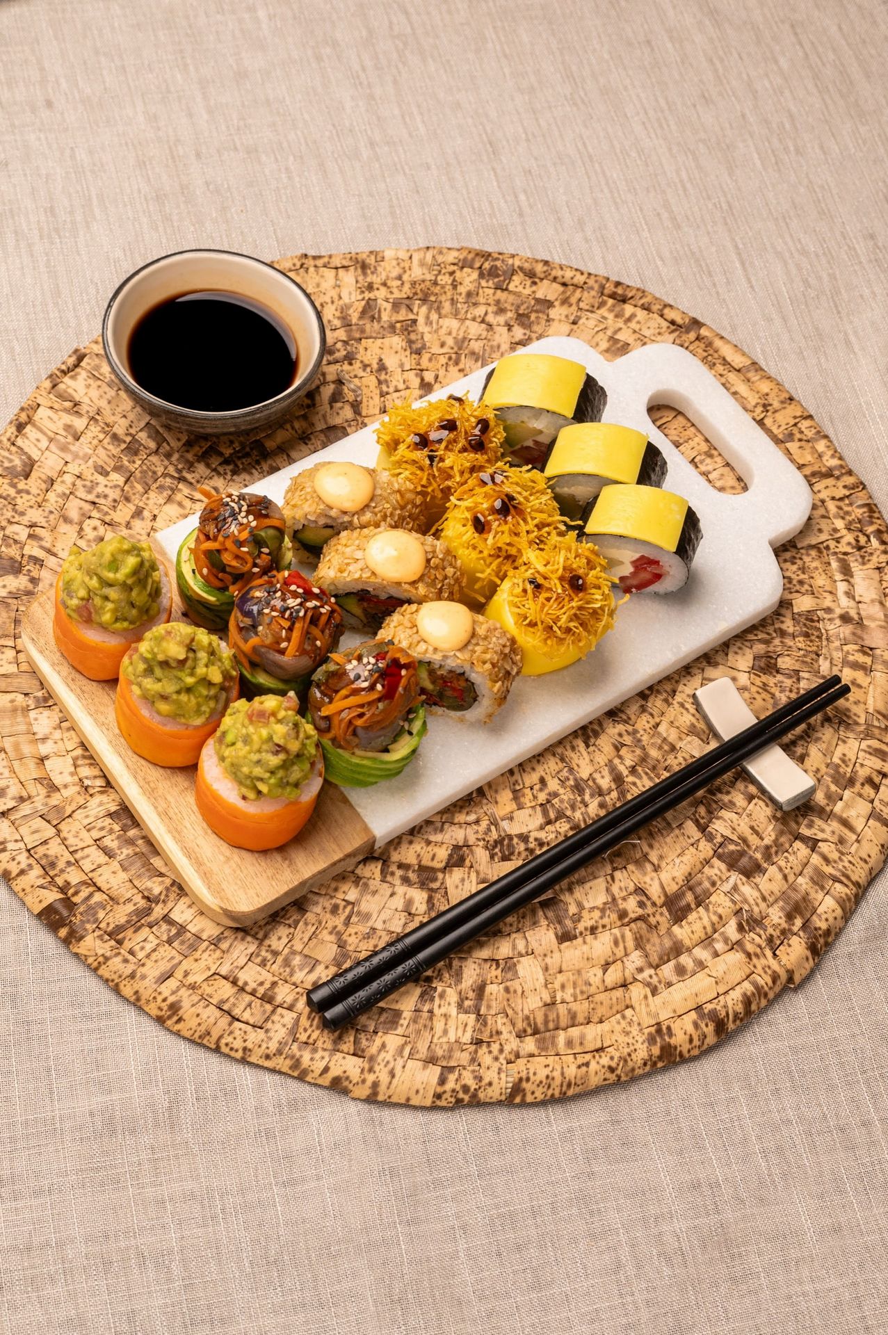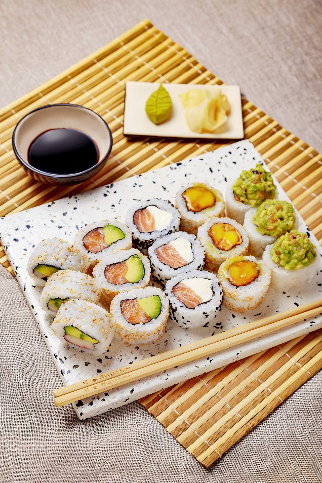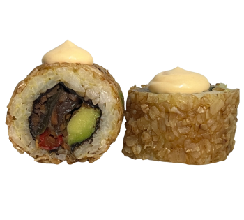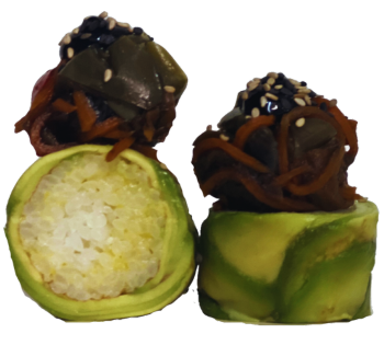 Relleno de Arroz frito. Envuelto en palta. Coronado con bouquet de verduras salteada, Salsa Teriyaki y sésamo mixto.