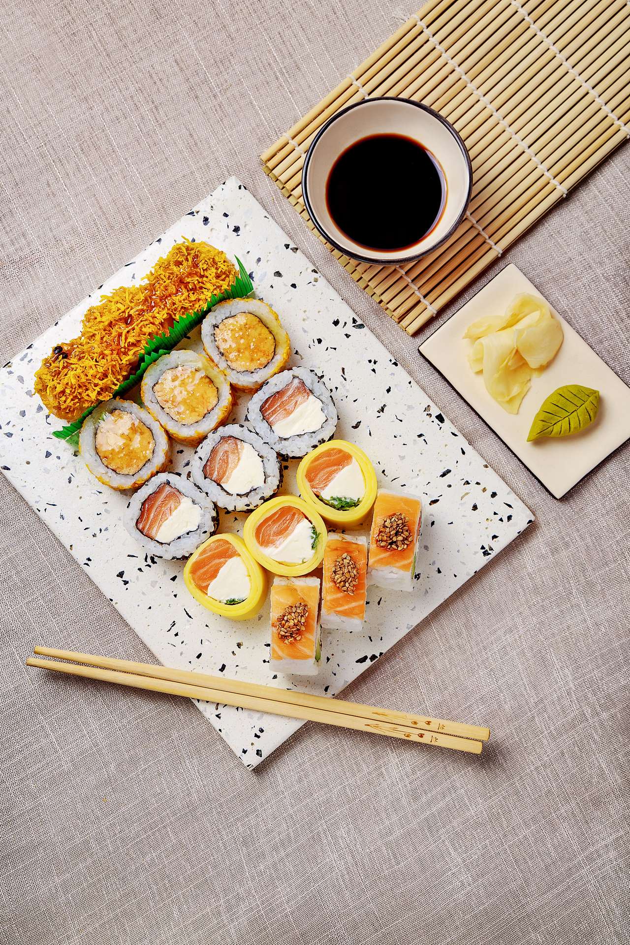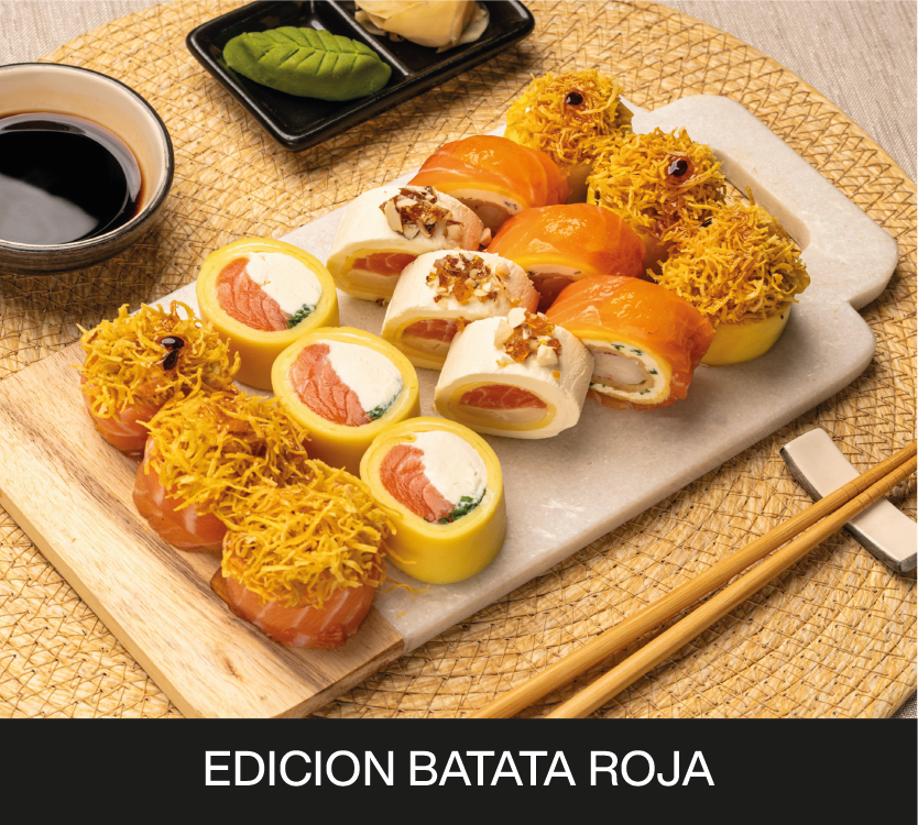 Envuelto en láminas de 🍳Tamago y Salmón. Coronado con crocante de BATATA y salsa de MARACUYÁ.