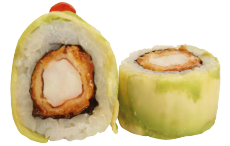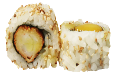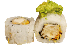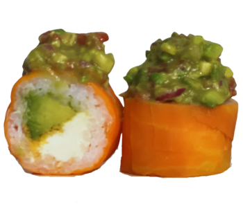 Relleno de Langostinos en Tempura y batata crocante. Coronado con GUACAMOLE.