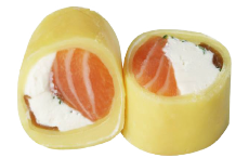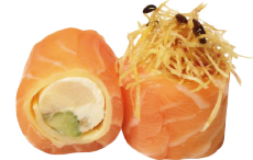 Envuelto en finas láminas de SALMÓN AHUMADO. Coronado con Mayonesa de oliva y CAVIAR.