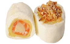 Envuelto en 🍳Tamago, cubierto en láminas de queso y coronado con almendras caramelizadas.